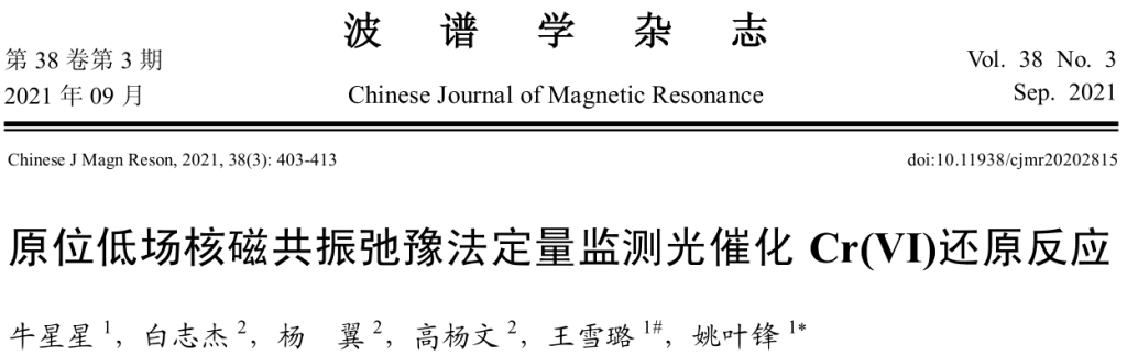 牛星星, 白志杰, 杨翼,等. 原位低场核磁共振弛豫法定量监测光催化Cr(Ⅵ)还原反应[J]. 波谱学杂志, 2021, 38(3):11。