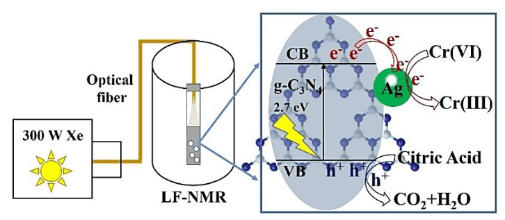 将单组分Cr(III)体系或混合组分(VI)-Cr(III)体系,与Ag/g-C3N4催化剂(1Ag/g-C3N4、2Ag/g-C3N4、5Ag/g-C3N4和10Ag/g-C3N4)加入特制的NMR样品管,放入NMR谱仪,通过光纤将光通入到 NMR 样品管中,并对其进行原位LF-NMR检测。