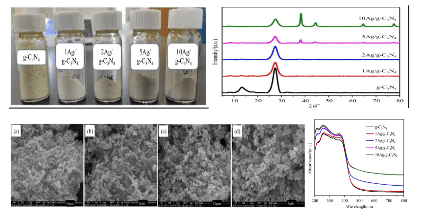 图2 依次为复合光催化剂的光学照片、XRS谱图、SEM图片、以及不同Ag负载量的UV-Vis 吸收光谱