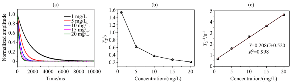 图 3(a)为不同浓度(1-20 mg/L)的单组分Cr(III)溶液的 CMPG 衰减曲线,在0.5T左右的场强下,质子的 CPMG信号的信噪比(SNR)相对较高。图3(b)为上述溶液的 T2值变化曲线,可知,随着体系中顺磁性 Cr(III)离子浓度的增大,体系的T2值呈现下降趋势。由图 3(c)可知,1/T 2与 Cr(III)离子浓度呈现出良好的线性关系。