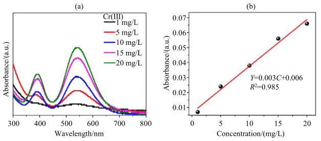 图4 Cr(III)体系的(a)UV-Vis吸收光谱和(b)吸光度随Cr(III)离子浓度的变化
