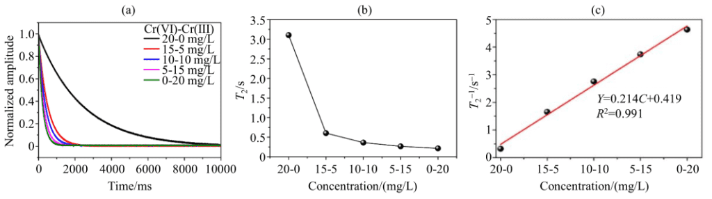 为更真实的反映光催化反应体系中 Cr(VI)和 Cr(III)的变化,作者对混合组分体系进行了研究。图 5(a)为混合组分体系的CMPG 衰减曲线。从图 5(a)可以看出,混合组分体系中质子 CPMG 信号的SNR 也相对较高,说明体系的改变不影响测试。由图 5(b)可知,随着混合体系中离子浓度梯度从20-0mg/L变化至0-20mg/L 时,体系的T2值同样呈现下降趋势。图 5(c)可知,混合体系的1/T2与混合组分中 Cr(III)离子浓度呈现良好的线性关系。