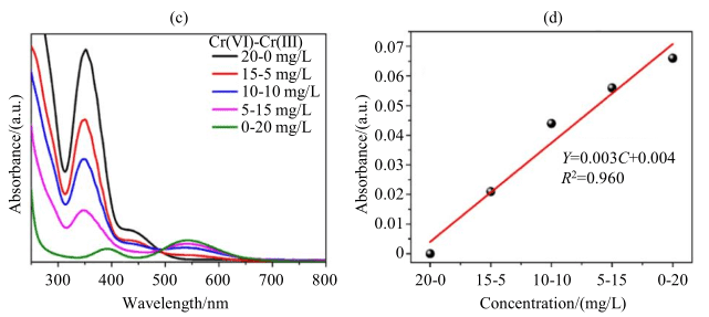 图6 Cr(VI)-Cr(III)混合体系(Cr(VI)-Cr(III)的浓度梯度从 20-0 mg/L 到 0-20 mg/L)的(c)UV-Vis 吸收光谱和(d) 吸光度随混合体系中 Cr(III)离子浓度的变化