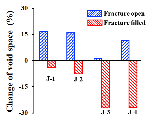 计算裂缝填充前后的孔隙变化率(图4),PVF(蓝色)反映压裂对总孔隙的改善效果,PVG(红色)反映基质孔隙转化为裂缝的量。压裂对微孔发育岩样(J-1和J-2)孔隙体积的改善效果更明显,但基质孔转化为裂缝的比例低。宏孔发育岩样(J-3和J-4)结论相反,总孔隙体积的改善效果一般,但基质孔转化为裂缝的比例高。其中,PVF通过比较M0和F0累积核磁信号量得到,PVG通过比较M0和G0累积核磁信号量得到。