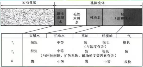 如图所示,对于油、气、水3种流体,虽然其横向弛豫时间有一定重合,但是流体扩散系数存在一定差异,因而利用基于弛豫一扩散的二维核磁共振信息便可以清楚分辨不同流体。