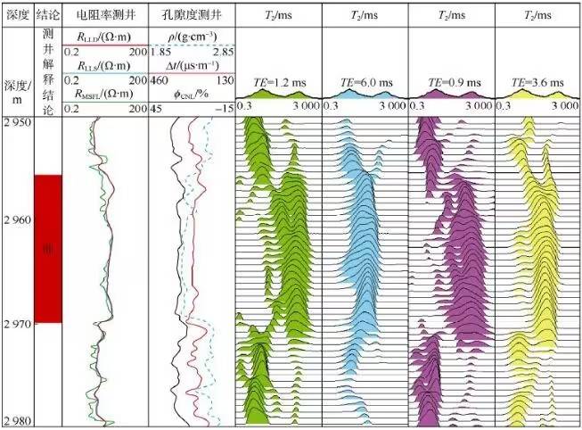 在2955~2970m井段,T2谱的形态以单峰分布为主,流体成分主要为自由流体,随着回波间隔TE增加,T2谱向弛豫快的方向移动,移动后的T2谱仍然以单峰分布为主。由于本地区原油粘度较低,利用移谱法难以在T2域内将油水信号分离,因而考虑用二维核磁来识别。将4种不同回波间隔条件下采集到的原始核磁信号进行数据累加、正交分解、相位角平滑以及滤波等处理后,获得相同深度不同回波间隔的4组回波串。将上述4组回波串进行联合反演,就可以获得弛豫一扩散二维核磁共振测井信息(图5)。