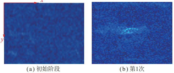 阶段Ⅰ,由于煤样较为致密,孔隙率较低,初始阶段煤样内部各区域信号响应非常微弱,如图九(a)~ (c) 所示。震动载荷冲击产生的震动波从高波阻抗的杆件传入低波阻抗的煤样,波形发生多次偏转,在此过程中煤基质产生破坏形成新的吸附孔,煤样内形成少量损伤区域,呈现点状分散分布。