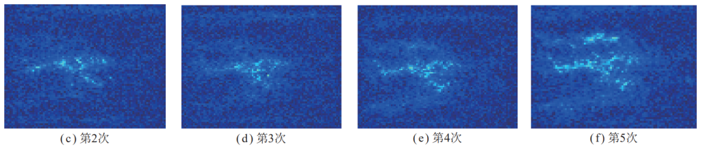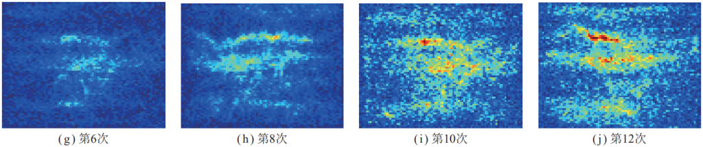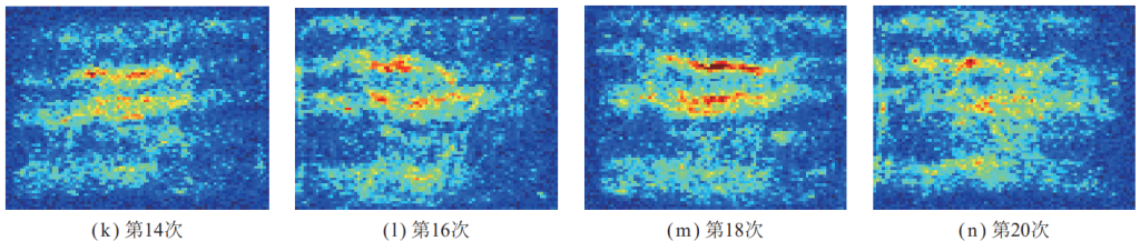 阶段Ⅱ,随着震动载荷冲击次数的增加,渗流孔开始逐步增多,损伤区域信号响应增强,并出现由点状分散分布向条状集中分布的趋势,如图九(d)~(g)所示。