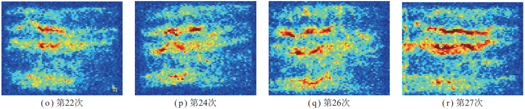 阶段Ⅳ,各条状损伤区出现复杂的条状形态,如图13(m)~(r)所示。震动载荷冲击使得裂隙持续连通,图中原有信号聚集区域颜色愈深,范围愈广,多次震动载荷冲击持续扩展并连通煤样内部各类孔隙和裂隙,最终煤样表面出现宏观裂纹。