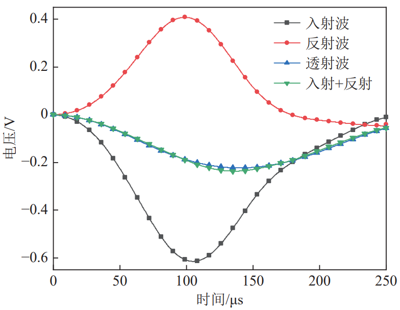 在煤体受到震动载荷冲击后,入射波应力和反射波应力之和与透射波应力近似相等,能够较好地满足应力平衡条件,证实了煤样在震动载荷作用过程中符合应力均匀性的假设,如图三所示。