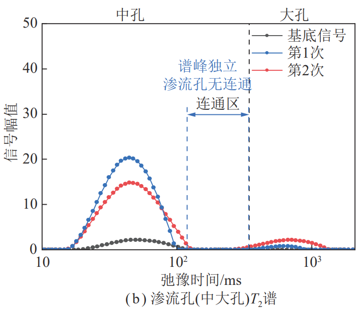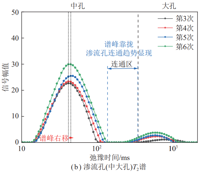 (2)孔隙稳定增长阶段,该阶段T2谱表现三峰分布形态,各谱峰仍相对独立,起初煤样内部连通性仍然较差,微裂隙尚未出现,在震动载荷多次冲击作用下,渗流孔发育,谱峰出现右移,弛豫时间增加,中孔与大孔间谱峰出现“靠拢”趋势,渗流孔连通趋势开始显现。